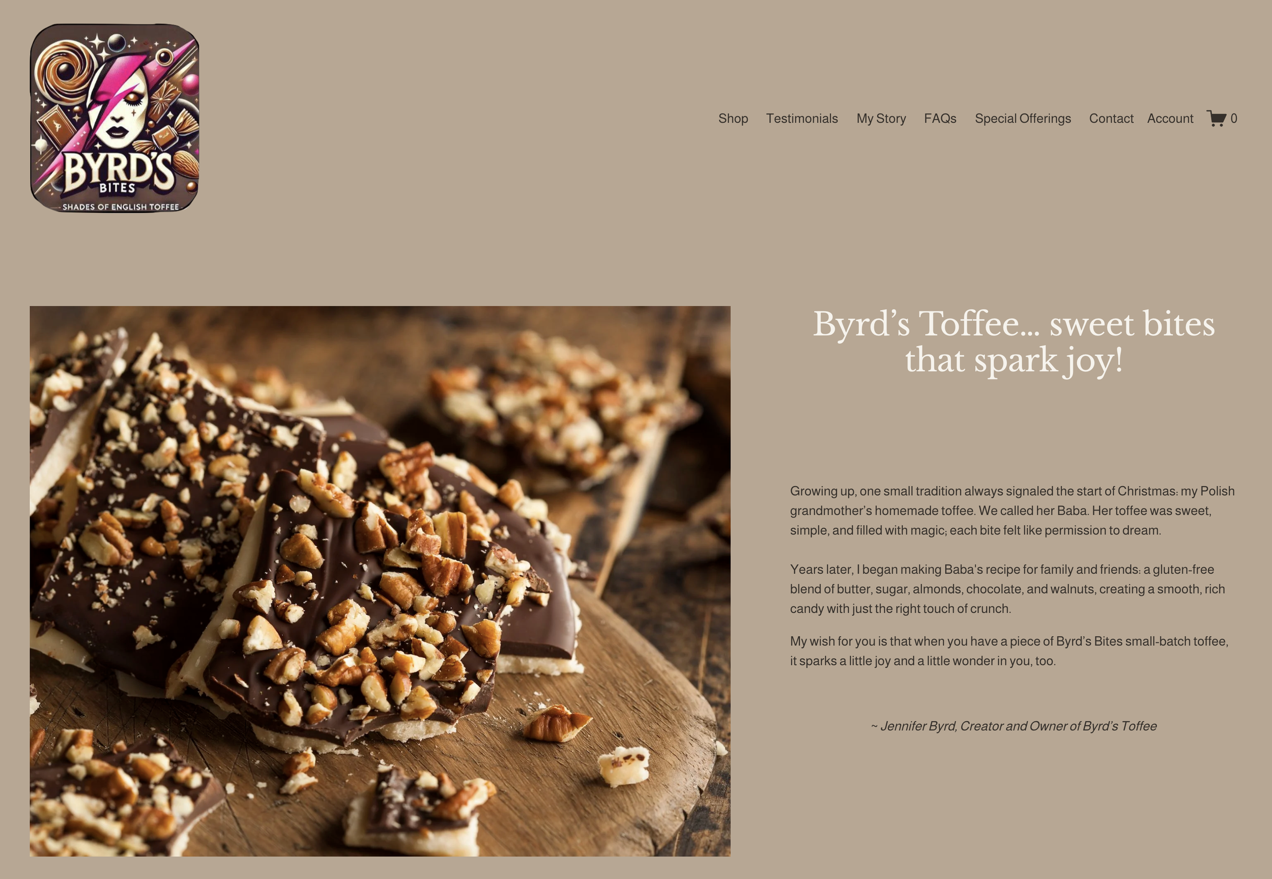 Jennifer Byrd has created a business making and selling a hand-crafted product that is her grandmother's (“Baba’s”) recipe for toffee. This website shares her story and connection to the history and heritage of her family’s toffee recipe and fulfills her dream of sharing this message with others.
